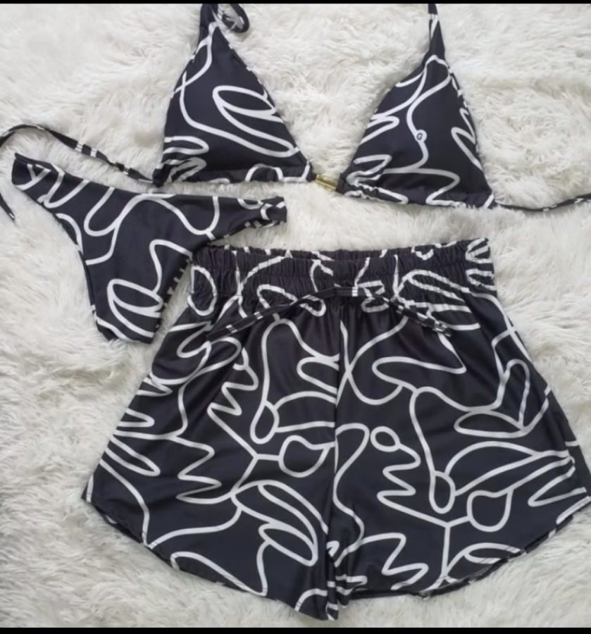 biquini 3 peças TRIQUINI - 3ROUPAS DE PRAIA , SHORT ,CALCINHA FORRADA ,TOP COM BOJO ,POLIAMIDA MATERIAL CONFECCIONADA EM TECIDO POLIAMIDA COM ELASTANO ,PROPORCIONANDO UMA SENSAÇÃO SUAVE E CONFORTAVEL , CALCINHA FORRADA ,TOP COM BOJO OFERECE MODELAGEM E SUPORTE A MAIS E UM SHORT ELEGANTE TAMANHO